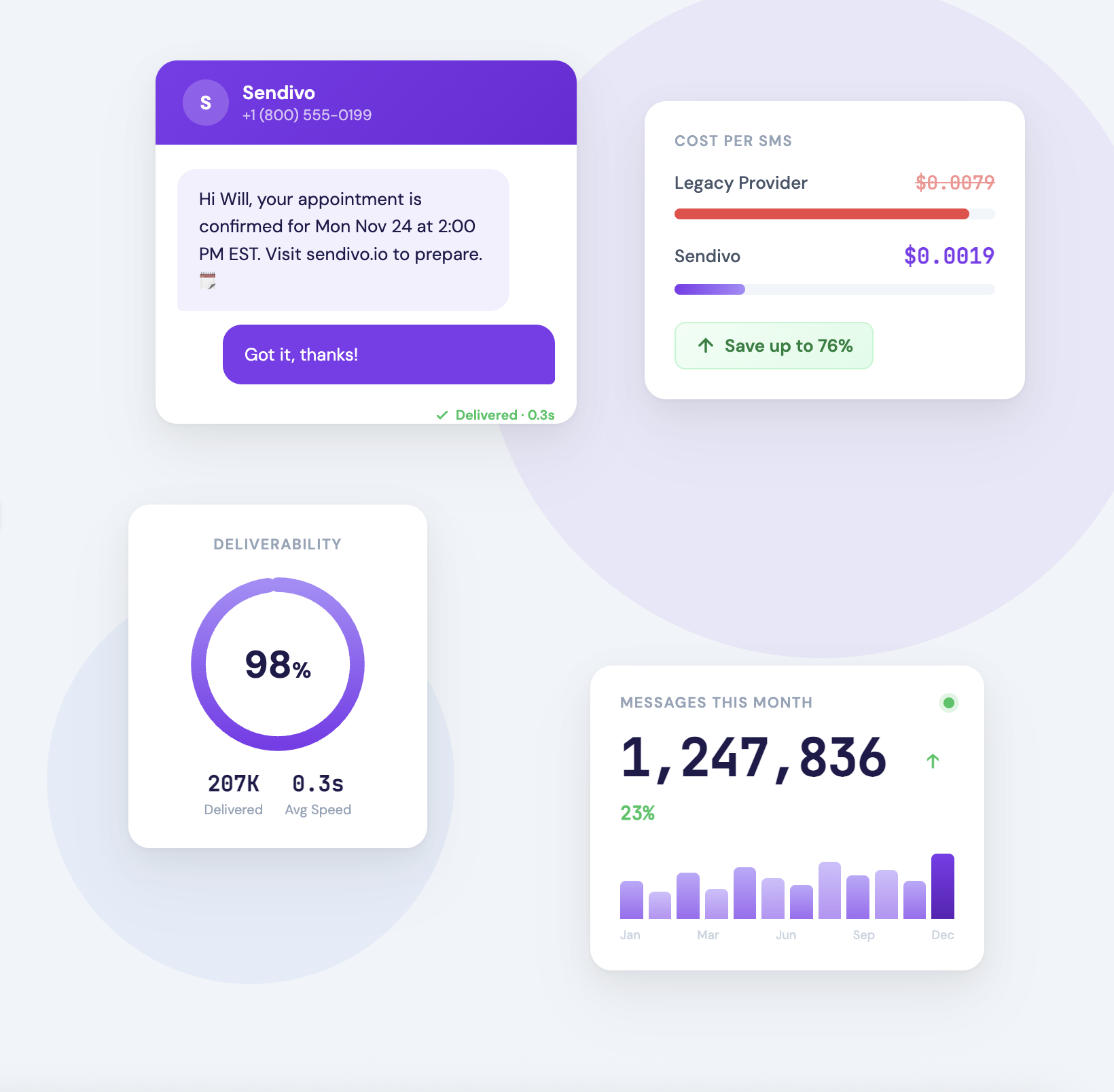 Sendivo is a high-deliverability SMS platform that allows you to scale faster with direct carrier routing, 48H campaign approvals, no quarterly fees, and pricing 90% cheaper than the competition.