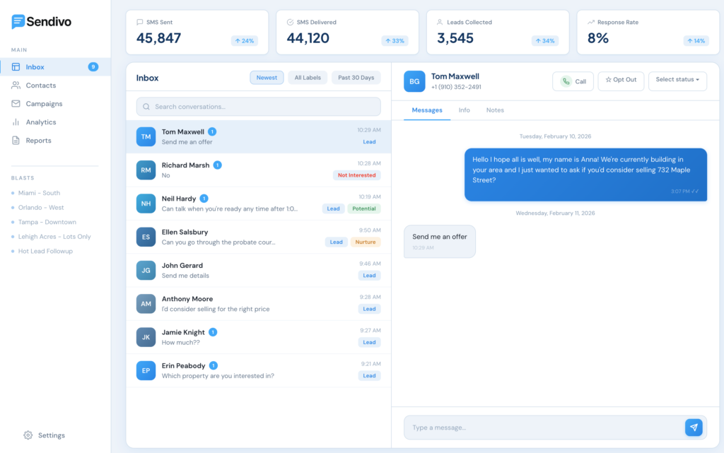 Other platforms give you a texting tool and call it a day. Sendivo gives you the whole machine — contact management, deal pipeline tracking, drip campaign automation, built-in calling with voicemail drops, and skip tracing integration. Everything an acquisition team needs, nothing it doesn't.